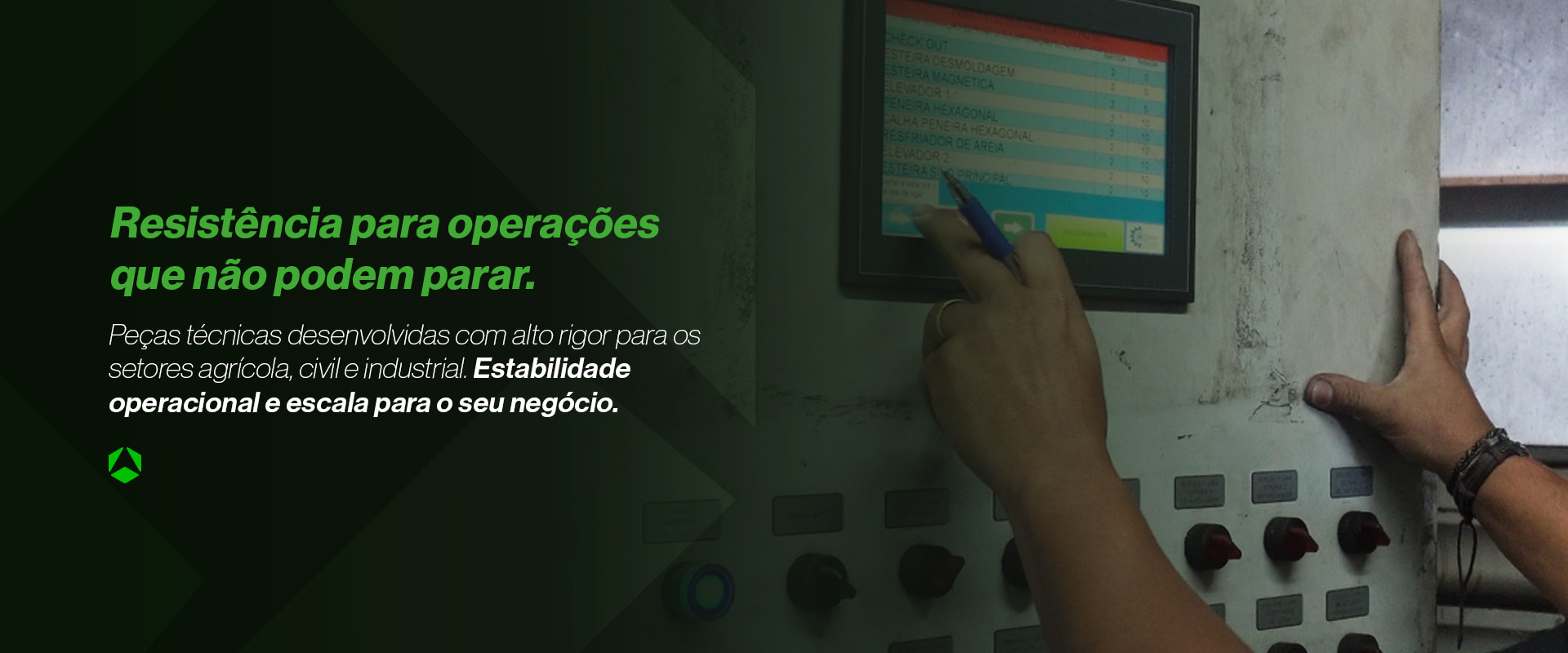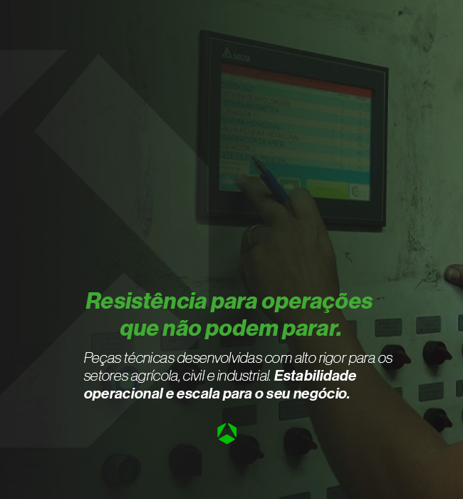 Atuamos com excelência em setores que exigem alto nível de resistência, desempenho e confiabilidade, como o agrícola, a construção civil e a indústria. Desenvolvemos peças técnicas projetadas para garantir o que é essencial para nossos clientes: estabilidade operacional, ganho de escala e continuidade dos negócios.